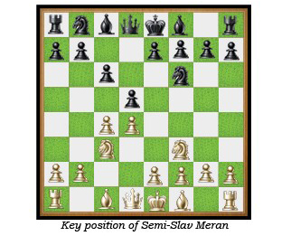 4...e6 (3...g6 Slav-Gruenfeld ) 5.e3 Nbd7 6.Bd3 dxc4 (6...Bd6 7.0-0 0-0 8.e4) 7.Bxc4 b5 8.Bd3 a6 9.e4 c5 10.e5 (10.d5 c4 11.dxe6 fxe6 12.Bc2 Qc7 13.0-0 Bb7 14.e5 Nxe5 15.Nxe5 Qxe5 16.Re1 Qd6 17.Bg5 Kf7 18.Bxf6 Qxd1 19.Raxd1 Kxf6 20.Be4 Bxe4 21.Nxe4+ Kg6 22.Re3 Be7 23.Nd6 e5 24.Rxe5 Kf6 =) 10...cxd4 11.Nxb5 axb5 (11...Nxe5 12.Nxe5 axb5 13.Bxb5+ Bd7 14.Nxd7 Qa5+ 15.Bd2 Qxb5 16.Nxf8 Rxf8 17.a4 Qc4 18.a5 Nd5 19.Qe2 Qxe2 20.Kxe2 Kd7 21.b4 Rfb8 22.Rhb1 Rb5 23.Kd3 e5 24.Kc4 Kc6 25.Rc1 Rab8 26.Rab1 f6 27.Rb3 h5 28.h3 h4 29.Rbb1 Ra8 =) 12.exf6 gxf6 13.0-0 Qb6 14.Qe2 Bb7 15.Bxb5 Bd6 16.Rd1 Rg8 17.g3 Rg4 18.Nd2 Rg8 19.Nc4 Qc5 20.Be3 Be5 21.Bxd4 Qd5 22.Bxd7+ Kxd7 23.Bxd4 Bxd4 24.Rxd4+ Ke7 25.Nd6 Rg5 26.Rad1 Bd5 27.Ne4 Re5 ±
