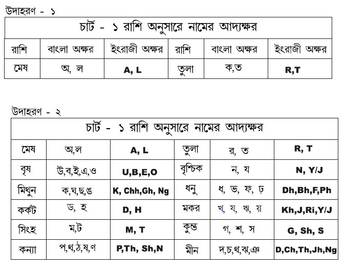 ৬) যাদের রাশিচক্র নেই। শুধুমাত্র জন্ম মাস জানা আছে, তারা জন্মমাস (সান সাইন) অনুসারে নামকরণ করবেন। রাশি অনুসারে নামের আদ্যাক্ষর দেখে (চার্ট-১ দেখুন) ।