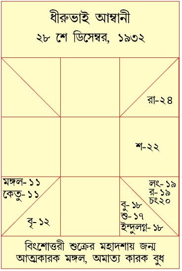 ধীরুভাই আম্বানি-র রাশিচক্রটি দেখুন (রাশিচক্র-২), এক ঝলক দেখলে মনে হবে একটা অতি সাধারণ বা গড়পড়তা একটা রাশিচক্র। প্রথমেই চোখে পড়বে অশুভ কালসর্প যোগ ও ধন নাশক যোগ। কিন্তু গভীর ভাবে পর্যবেক্ষণ করলে ধরা পড়বে জন্মছকটির অনন্য বৈশিষ্ট্য ও অভিনবত্ব। যেমন – জাতক লগন চাঁদা, ত্রিবিধ লগ্ন – জন্মলগ্ন, চন্দ্র-লগ্ন ও রবি-লগ্ন একই ধনু রাশি, ধনু দ্বি-স্বভাব অগ্নি রাশি। এছাড়া লগ্ন, পঞ্চম ও নবম তিনটি ভাবই অগ্নি রাশি। ত্রিবিধ লগ্ন ও তিনটি কোণ স্থান অগ্নি রাশি হওয়ায় জাতকের চরিত্রে একটা বিশেষ সাযুজ্য (Integrity) দিয়েছে। জাতকের দেহ-মন-আত্মার ঐক্য ও আত্মিক বোধ সুদৃঢ় করেছে। জাতকের জীবনে ধনু রাশির সার্বিক গুণ পূর্ণ মাত্রায় বর্তাবে। জাতকের জীবনে ধনু রাশির সকল কারকতার সমাবেশ ঘটবে। জাতক হবেন – নির্ভীক, সজাগ সচেতন, আত্মবিশ্বাসে ভরপুর, ধীর-স্থির, অবিচল লক্ষ্য ও দীর্ঘমেয়াদি পরিকল্পনা, ধৈর্য ও নিষ্ঠায় অবিচল। জাতক বাইরে কর্মী অন্তরে আত্মবোধে লীন। সুদূরপ্রসারী ভাবনা-চিন্তা ও লক্ষ্য সামনে রেখে মরণপণ লড়াই করা, লেগে থাকা, ভিতরে ও বাহিরে সমান দৃষ্টি ও আত্মপ্রতিষ্ঠায় অবিচল ব্যক্তিত্ব সম্পন্ন। এ জাতক জীবন যুদ্ধের লড়াকু সৈনিক, ভাগ্যের হাতের পুতুল নয়। প্রবল পুরুষকারে নিজের ভাগ্য, সাধ-আহ্লাদ-স্বপ্নকে বাস্তবায়িত করবেনই।