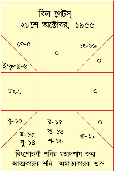 বিল গেটস-এর রাশিচক্রটি দেখুন (রাশিচক্র-১) – জাতকের কর্কট লগ্ন, মীন রাশি, উত্তর ভাদ্রপদ নক্ষত্র। লগ্নপতি চন্দ্র নবমে, বুধ স্বক্ষেত্রে ও যোগকারক মঙ্গল যুক্ত। সপ্তম পতি শনি তুঙ্গস্থ হয়ে স্বক্ষেত্রস্থ শুক্রের সঙ্গে সহাবস্থান করছে। নবম পতি বৃহস্পতি দ্বিতীয় ভাবে অর্থাৎ ধন ভাবে। জাতকের আত্মকারক গ্রহ শনি এবং অমাত্যকারক গ্রহ শুক্র। স্বক্ষেত্রস্থ শুক্রের সঙ্গে শনির সহাবস্থান বিশেষ শুভকারক এবং যোগকারক হয়েছে। জাতকের লগ্ন, পঞ্চম ও নবম, এই তিনটি ভাবই জলরাশিস্থ হয়েছে। লগ্নপতি চন্দ্র, পঞ্চম ও দশমপতি মঙ্গল ও ভাগ্যপতি বৃহস্পতি শুভভাবস্থ হওয়ার ফলে জাতকের দেহ-মন-আত্মার সবলতা(লগ্ন), বিদ্যা-বুদ্ধি-বিচার ক্ষমতা ও স্বাভাবিক প্রতিভার বিকাস(পঞ্চম) এবং ভাগ্য ভাব(নবম) সুদৃঢ় হয়েছে। জাতক কম্পিউটার ও সফটওয়্যার ব্যবসায় সাফল্য লাভ করেছেন ও প্রভূত ধন-সম্পদ ও প্রতিষ্ঠা লাভ করেছেন। সপ্তম পতি শনি তুঙ্গস্থ হয়ে শুক্র যুক্ত। শনি যন্ত্র ও যন্ত্রাংশের কারক অন্যদিকে রাহু ইলেকট্রনিকস ও সফটওয়ারের কারক। চতুর্থ ভাবে শুক্র, শনি ও রবি সহাবস্থান করায় দ্বিতীয়, সপ্তম ও একাদশ ভাবের শুভ সংযোগ স্থাপন করেছে এবং দশম ভাবকে পূর্ণ দৃষ্টি দিচ্ছে। জাতকের তৃতীয় ভাবে বুধ স্বক্ষেত্রস্থ হয়ে মঙ্গল যুক্ত হওয়ায় স্বাভাবিক বিষয়বুদ্ধি, ব্যবসা-বাণিজ্যের প্রতি আগ্রহ এবং মঙ্গলের প্রভাবে ঝুঁকি নেওয়ার ক্ষমতা ও সাহস দিয়েছে। জাতকের কর্ম ভাবটি খুবই শুভ। দশমে রবি, মঙ্গল, রবি, শুক্র, শনি ইত্যাদি পাঁচটি গ্রহ পূর্ণ দৃষ্টি দিচ্ছে। এছাড়া দশম ভাবটি চর, অগ্নি রাশি ও নিষ্কলুষ, অর্থাৎ কোনও পাপগ্রহের অবস্থান বা দৃষ্টি নেই। ফলে জাতকের কর্মভাগ্য অতীব সুদৃঢ়। ব্যবসা বাণিজ্যে সাফল্য পেতে হলে- সাহস, ঝুঁকি নেওয়ার ক্ষমতা, লড়াই করার শক্তি, বিপক্ষকে পরাস্ত করার শক্তি ও প্রতিদ্বন্দ্বিতায় টিকে থাকার জন্য শক্তি ও সূক্ষ্ম বুদ্ধির আবশ্যক হয়। ষষ্ঠ ভাবও অগ্নি রাশি, ষষ্ঠ ভাবে রাহু, শনি, মঙ্গল ও বৃহস্পতি –এই চারটি গ্রহের পূর্ণ দৃষ্টি থাকায় ষষ্ট ভাব যথেষ্ট বলশালী হয়েছে। ফলে জাতক ব্যবসায় অনায়াস সাফল্য ও দীর্ঘস্থায়ী প্রতিষ্ঠা লাভ করেছেন।